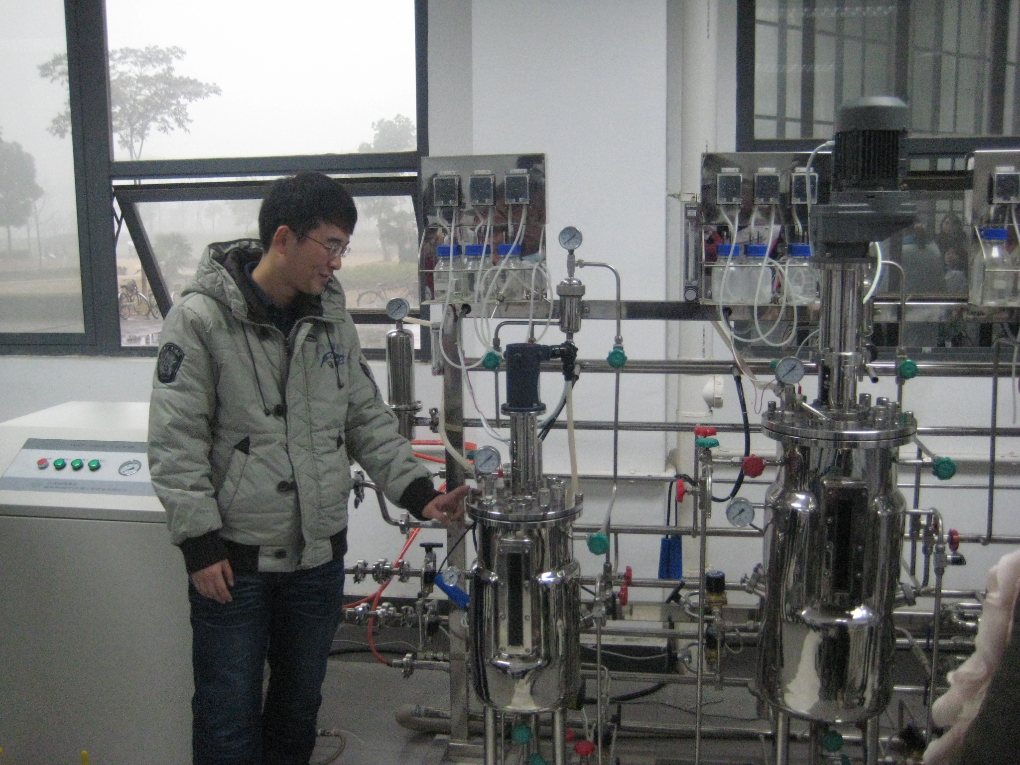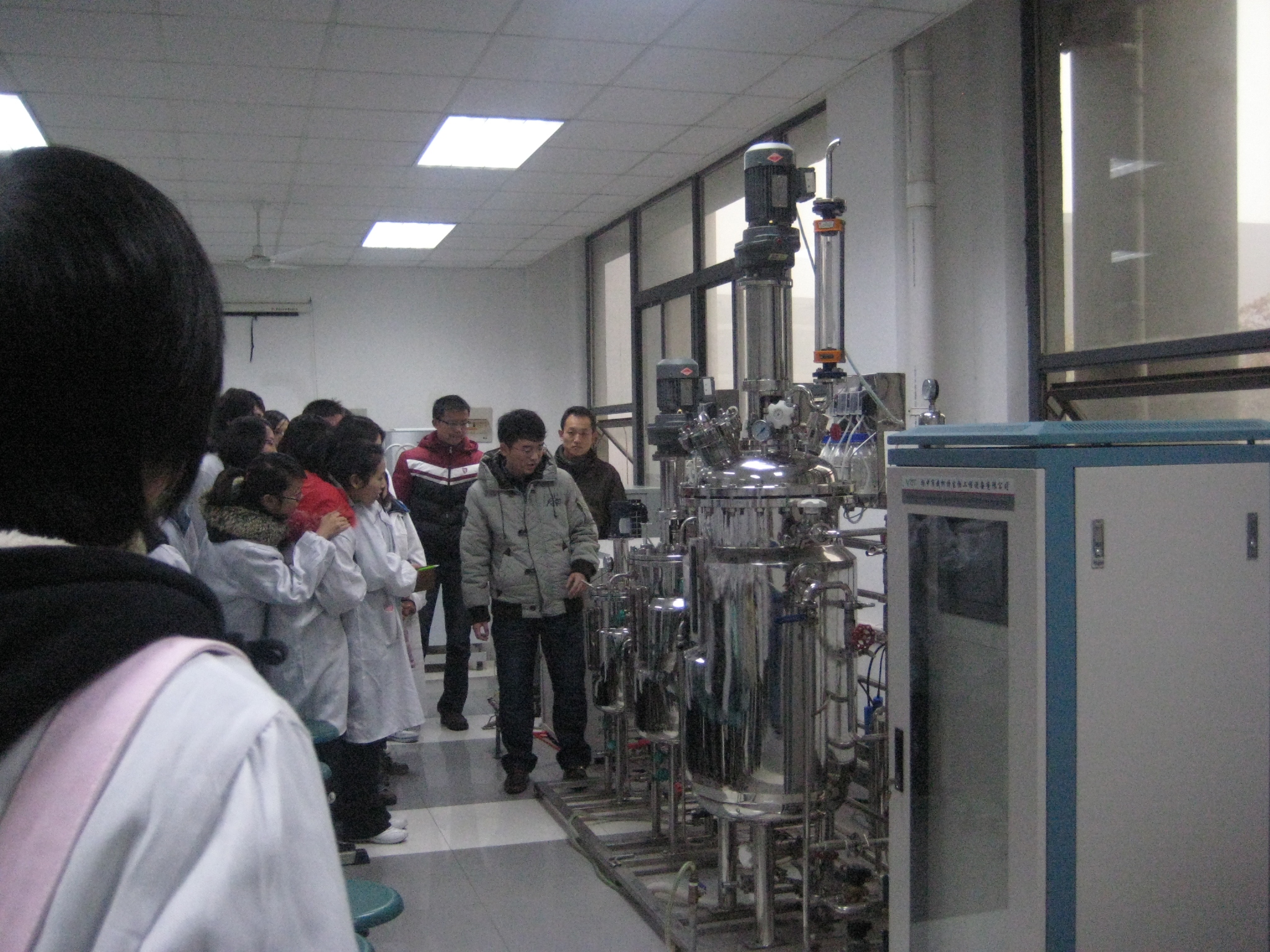 此行由安大教授,讲师陪同,师生一行人重点参观了安徽大学生化实验室,实地学习了发酵罐的主要部件、使用方法及操作步骤、发酵罐附加装置,了解了发酵罐的维护保养及注意事项等知识。在安大教师的讲解下,知道了发酵罐广泛应用于乳制品、饮料、生物工程、制药等行业,罐体设有夹层、保温层、可加热、冷却、保温。按照发酵罐的设备,发酵罐可分为机械搅拌通风的和非机械搅拌通风发酵罐,按照微生物的生长代谢需要,分为好气型发酵罐和厌气型发酵灌。罐体的顶盘上有控制传感器,最常用的有pH电极和DO电极,用来监测发酵过程中发酵液pH和DO的变化控制器,用来显示和控制发酵条件等等知识。在参观学习过程中,学生们不断向负责讲解的老师提问,以求解决理论学习过程中未曾遇到过的问题。