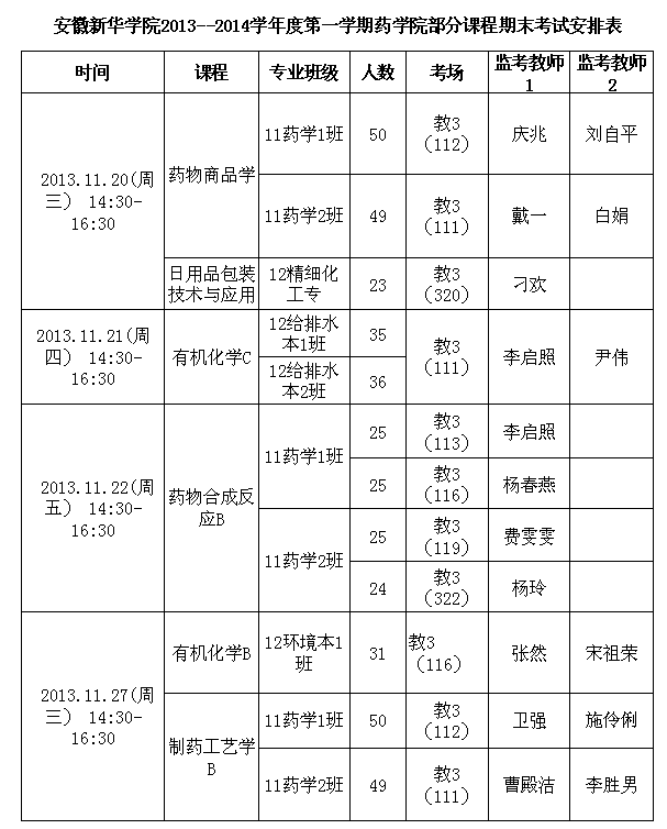 安徽新华学院2013--2014学年度第一学期药学院部分课程期末考试安排表